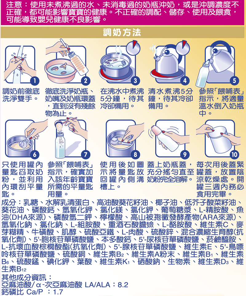 成分:乳糖、水解清蛋白、高油酸葵花籽油、椰子油、低芥子酸菜籽油、葵花油、磷酸鈣、氫氧化鉀、氯化鎂、氯化鉀、葡萄糖漿、L-精胺酸、魚油(DHA來源)、磷酸氫二鉀、檸檬酸、高山被孢黴發酵產物(ARA來源)、氫氧化鈉、氯化鈉、L-組胺酸、重酒石酸膽