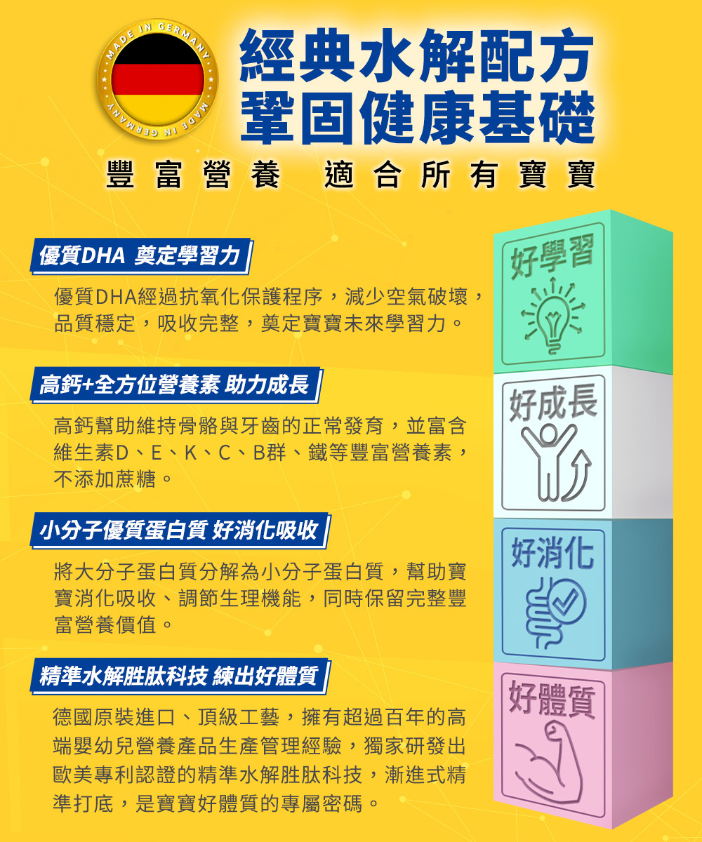 成分:水解乳清蛋白、麥芽糊精、低芥子酸菜籽油、高油酸葵花籽油、葵花籽油、乳糖、磷酸氫鈣(無水)、氯化鈣、氫氧化鉀、磷酸鈣、氯化鎂、葡萄糖漿、檸檬酸、氫氧化鈉、魚油(DHA來源)、維生素C、高山被孢黴發酵產物(ARA來源)、硫酸亞鐵、硫酸鋅、混合濃縮生育醇(抗氧化劑)、維生素E、菸鹼醯胺、L-抗壞血酸棕櫚酸酯(抗氧化劑)、乳酸菌、本多酸鈣、硫酸銅、維生素A粉末、維生素B1、維生素B6、維生素B2、硫酸錳、葉酸、碘化鉀、維生素K1、硒酸鈉、生物素、維生素D3、維生素B12